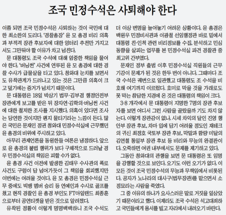 <경기일보>는 21일 사설 23면 <조국 민정수석은 사퇴해야한다>에서 “경찰총장 윤 모 총경 비리의혹과 부적격 장관후보자에 대한 엉터리 추천만 가지고서도 그만둬야할 이유가 차고 넘친다...